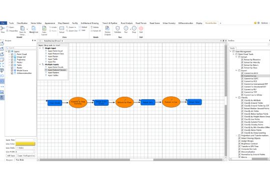 El módulo ModelBuilder incorpora flujos de trabajo por lotes totalmente personalizables que permiten procesar nubes de puntos, datos vectoriales y ráster con un solo clic. Gracias a su avanzado motor de computación en clúster, el sistema distribuye las tareas de georreferenciación, clasificación, reconstrucción 3D y procesamiento masivo de datos de manera paralela, logrando una eficiencia superior y tiempos de respuesta considerablemente más rápidos incluso en proyectos de gran escala.